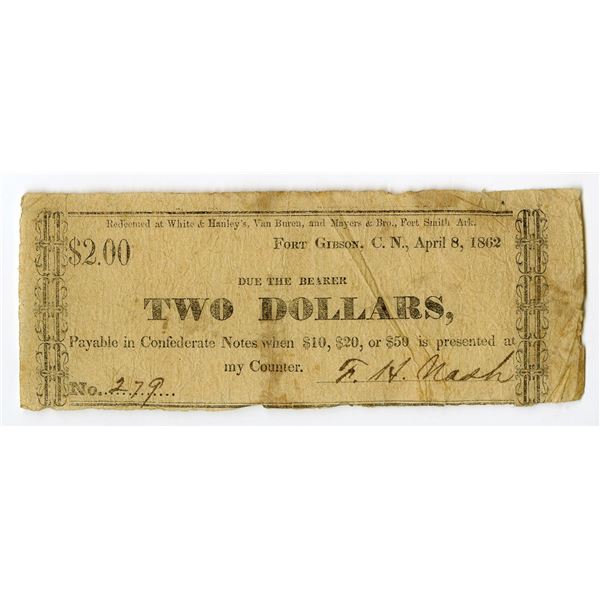 Fort Gibson, Cherokee Nation, Indian Territory (Oklahoma). April 8, 1862, F.H. Nash. $2, Burgett-4. Durand IT-37, Issued obsolete scrip note, Dated Ap