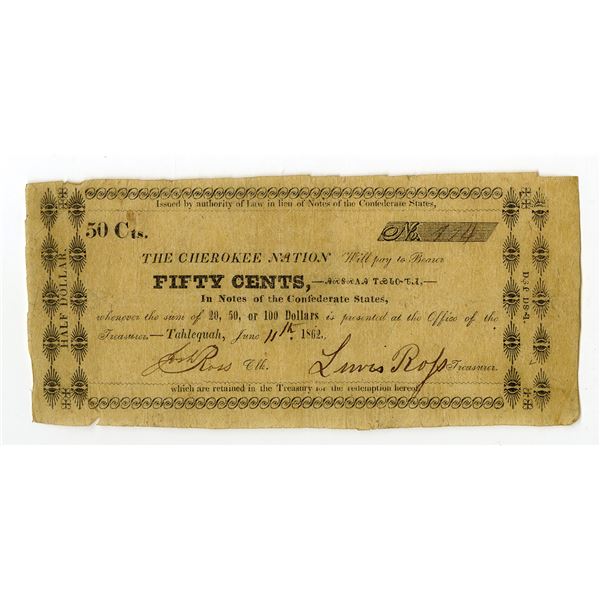 26 - Tahlequah, C.N., Office of the Treasurer, 1862, 50 Cents, Obsolete Scrip Note Lewis Ross SignatureArchives International Auctions