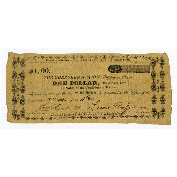 Tahlequah, Cherokee Nation (Oklahoma). June 11, 1862, Office of the Treasurer. $1, Cr. CHR N-2, Burgett-6, Durand IT-95, Issued obsolete scrip note, D