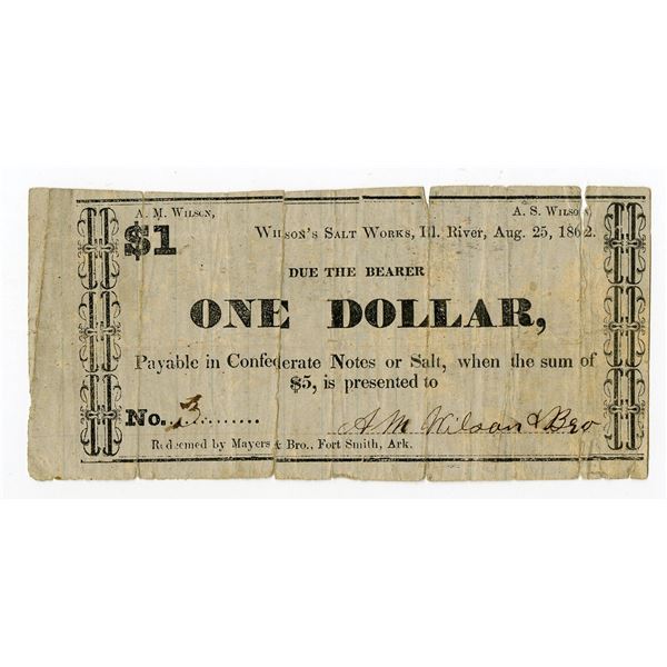 Wilson's Salt Works, Illinois River, Indian Territory. August 25, 1862. A.M. Wilson & Bro. $1, Unlisted in Rothert, August 25th, 1862, Very ...