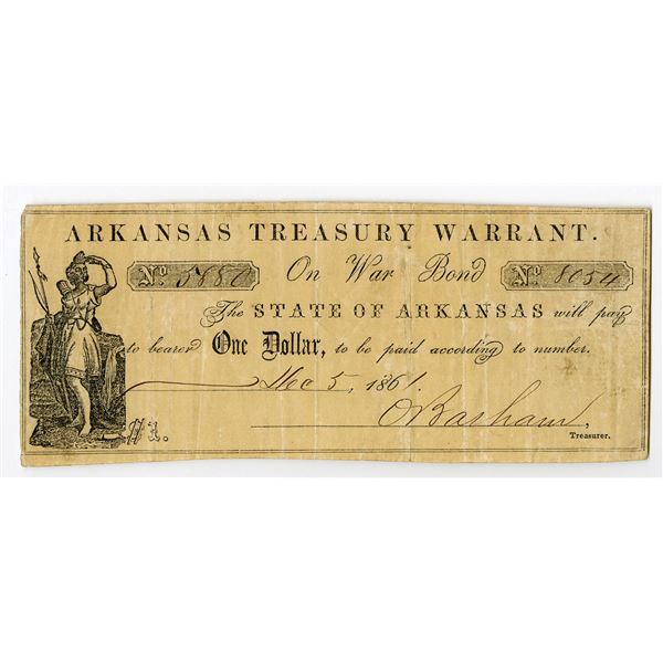 32 - Arkansas Treasury Warrant, On War Bond, 1861, $1, Obsolete Scrip NoteArchives International Auctions