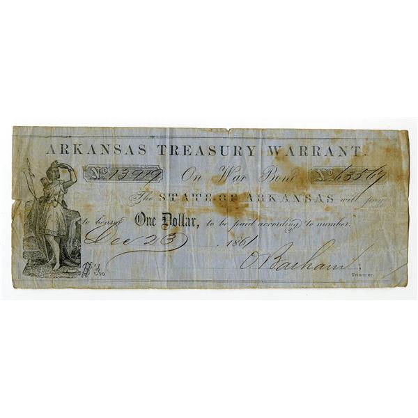 Little Rock, Arkansas. December 6, 1861, Arkansas Treasury Warrant. $1, (Cr.4 Rothert 377-1), Issued obsolete scrip note, Act of November 14th &...
