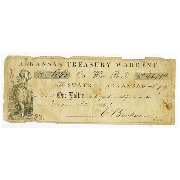 31 - Arkansas Treasury Warrant, On War Bond, 1861, $1, Obsolete Scrip NoteArchives International Auctions