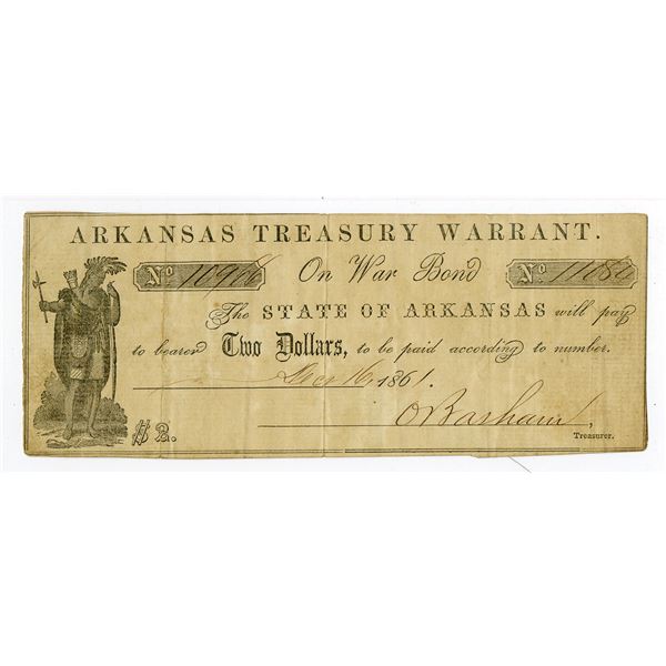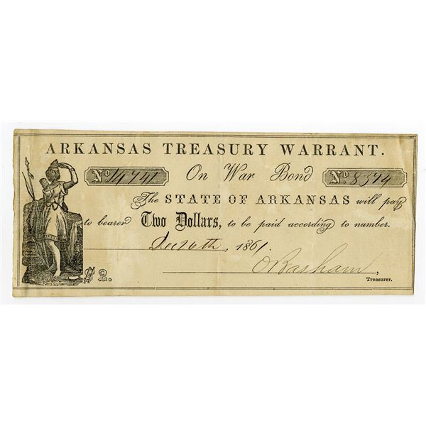 34 - Arkansas Treasury Warrant, On War Bond, 1861, $2, Obsolete Scrip NoteArchives International Auctions