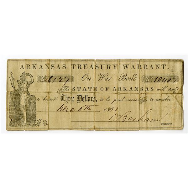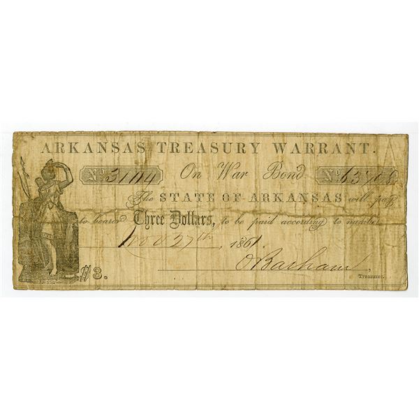 41 - Arkansas Treasury Warrant, 1861, $3, Obsolete Scrip NoteArchives International Auctions