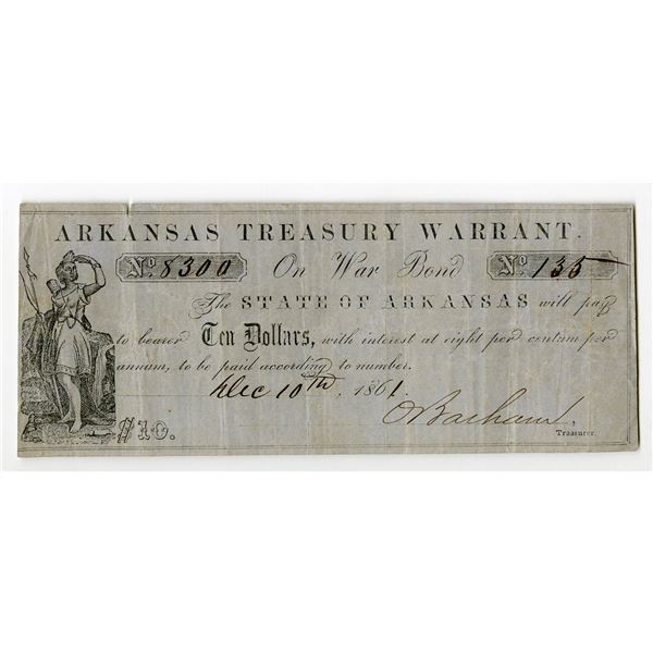 37 - Arkansas Treasury Warrant, On War Bond, 1861, $10, Obsolete Scrip NoteArchives International Auctions