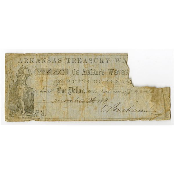 Little Rock, Arkansas. December 30, 1861, Arkansas Treasury Warrant. $1, (Cr.1 Rothert 375-1), Issued obsolete scrip note, Act of November 14th &...