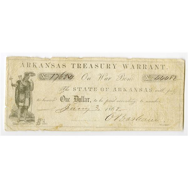 Little Rock, Arkansas. January 17, 1862, Arkansas Treasury Warrant. $1, (Cr.22 Rothert 386-1), Issued obsolete scrip note, Act of November 14th &...