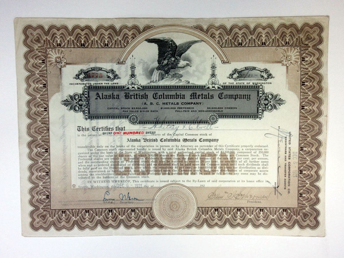 The Alaska British Columbia Metals Company was incorporated in Washington in 1915. The company owned four groups of claims in British Columbia, including the Torino Company's mines and the Dewdney group, or Indian Chief mine of the Dewdney Canadian Syndicate; optioned by the Tidewater Copper Company. A. B. C. also owned the Stikine group, three claims of the Stikine Mining Company located 115 miles from Wrangel, Alaska, up the Stikine River. It also owned the Glenora group, three claims, located five miles from Glenora, 150 miles up the Stikine river from Wrangel. Finally, A. B. C. owned the Jumbo group, four claims, located on Copper Creek, at the end of Torino Inlet, Clayoquot mining division, Vancouver Island, British Columbia.
