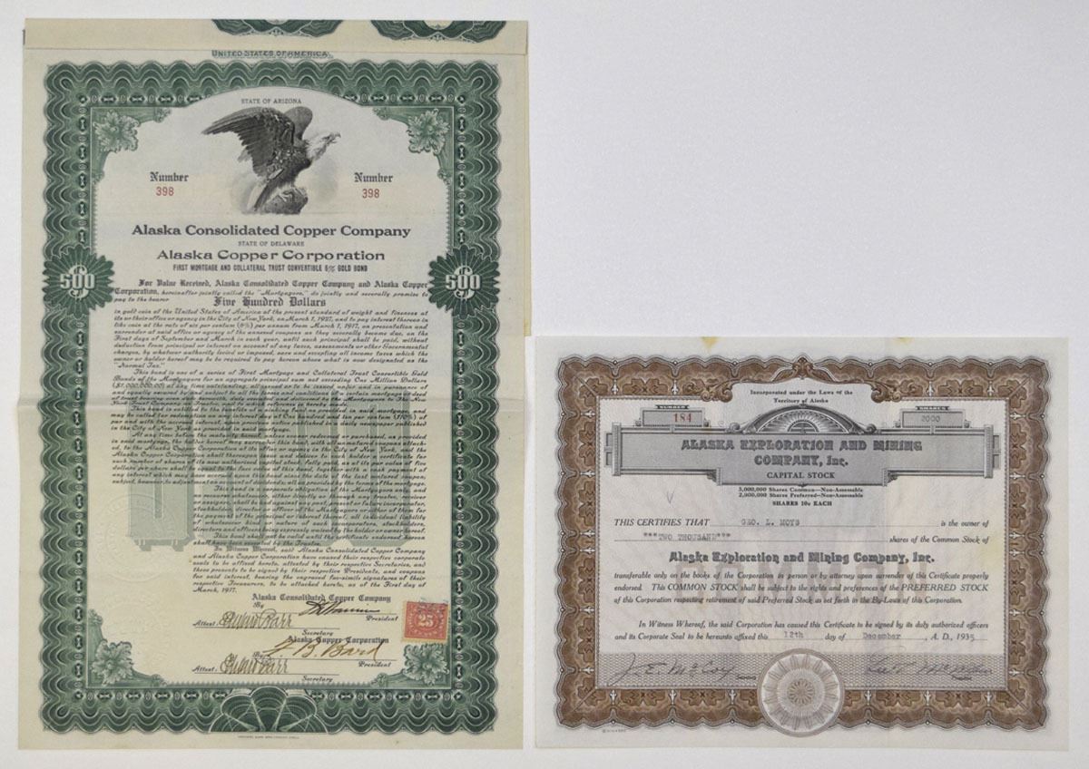Alaska. 1917-35. Lot of 2 pieces from Alaska’s early mining era, Alaska Consolidated Copper Co., (Inc. in AZ or DE) 1917, $500 I/U First Mortgage and Collateral Trust Convertible 6% Gold Bond, XF; and, Alaska Exploration and Mining Co., Inc., Territory of Alaska, 1935, 2000 shares, I/U common stock. XF condition. (2)