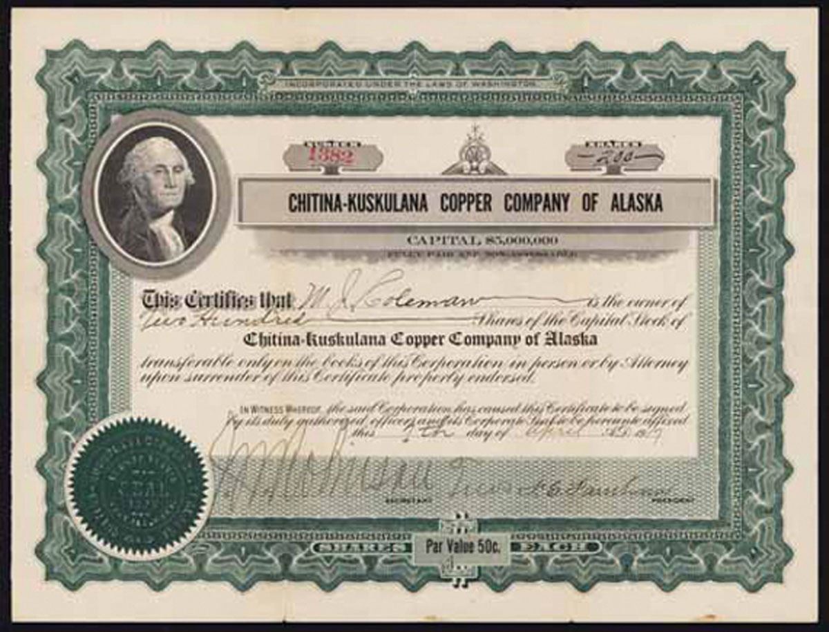 Alaska. 200 Shares Capitol Stock, I/U, Certificate. Black print with a green border, no under tint. Portrait of George Washington on top left. VF condition. Scarce Alaska mining certificate.