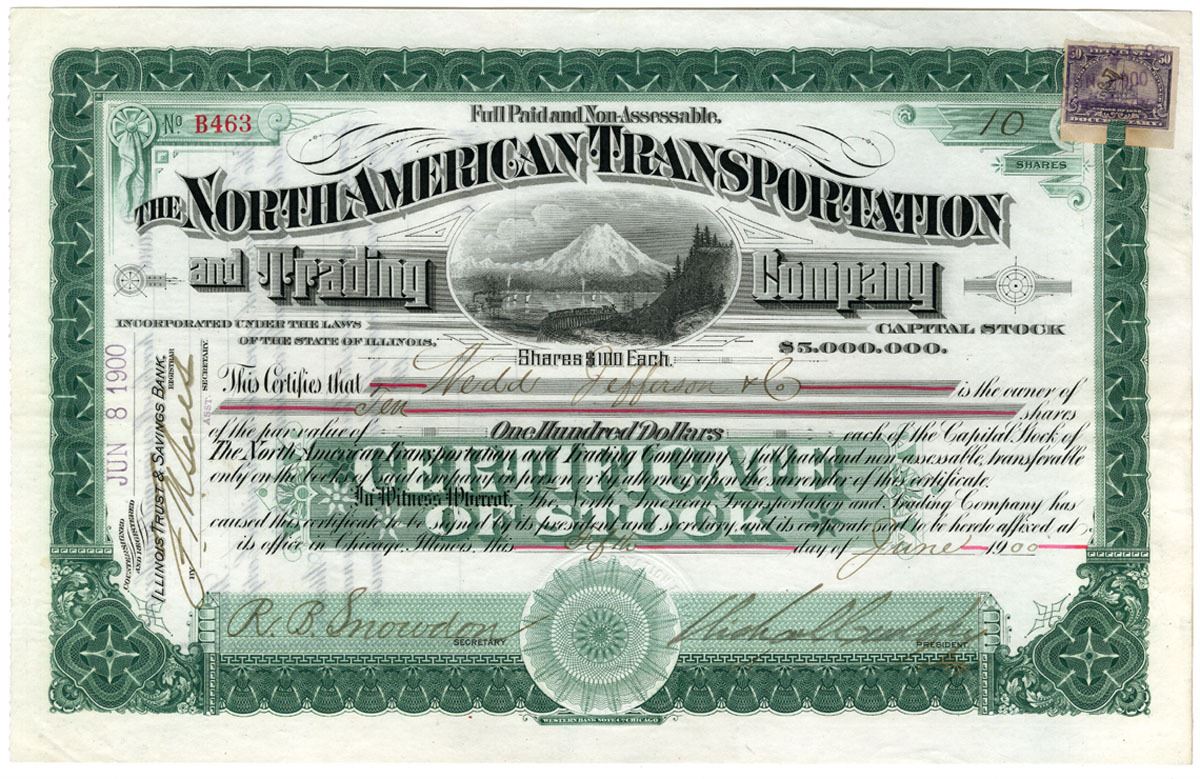 Alaska (Inc. in Chicago, IL.),1900. 10 Shares Capital Stock I/U Certificate, Black on green border with snow capped mountain at center and small trains and ships in harbor below, 50 Cent revenue stamp at top right corner, S/N B463, XF condition. WBNC.