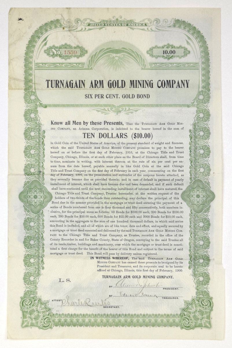 Alaska, (Inc. in Arizona), 1906. $10 I/U 6% Gold Coupon Bond, Black on green border and underprint, Company title at top, S/N 1559, VF condition. The Turnagain Arm Gold Mining Company was organized in 1905–1906 during the height of activity in Alaska’s Hope–Sunrise district along the Kenai Peninsula. This region had first seen prospectors in the 1890s after discoveries on Resurrection and Sixmile Creeks, leading to a short-lived but vigorous gold rush. The company issued both stock and gold bonds to finance development, typical of Alaska ventures that relied on outside investment to work remote placer and lode claims draining into Turnagain Arm. While records of sustained production are scarce, its securities capture a vivid moment in Alaska’s early mining history, when hopeful investors backed enterprises in one of the Territory’s most famous districts. The Turnagain Arm camps remained active into the 1910s, with placer mining continuing intermittently until curtailed by World War II
