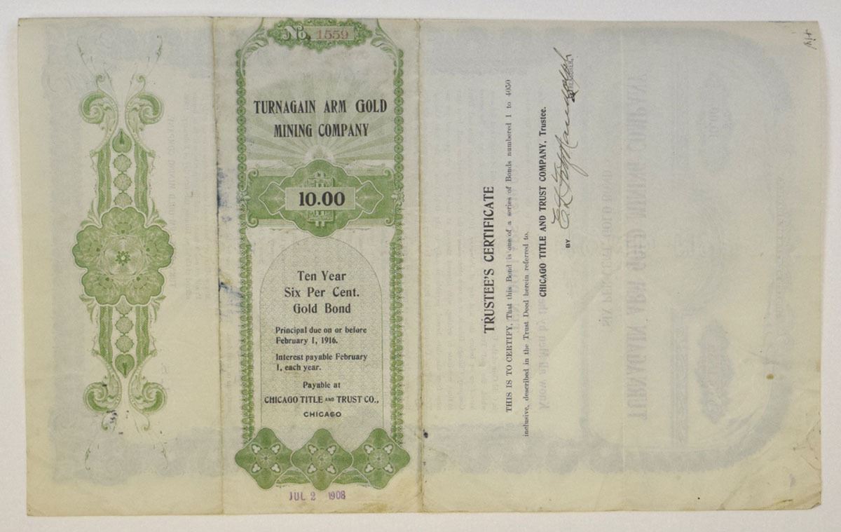 Alaska, (Inc. in Arizona), 1906. $10 I/U 6% Gold Coupon Bond, Black on green border and underprint, Company title at top, S/N 1559, VF condition. The Turnagain Arm Gold Mining Company was organized in 1905–1906 during the height of activity in Alaska’s Hope–Sunrise district along the Kenai Peninsula. This region had first seen prospectors in the 1890s after discoveries on Resurrection and Sixmile Creeks, leading to a short-lived but vigorous gold rush. The company issued both stock and gold bonds to finance development, typical of Alaska ventures that relied on outside investment to work remote placer and lode claims draining into Turnagain Arm. While records of sustained production are scarce, its securities capture a vivid moment in Alaska’s early mining history, when hopeful investors backed enterprises in one of the Territory’s most famous districts. The Turnagain Arm camps remained active into the 1910s, with placer mining continuing intermittently until curtailed by World War II