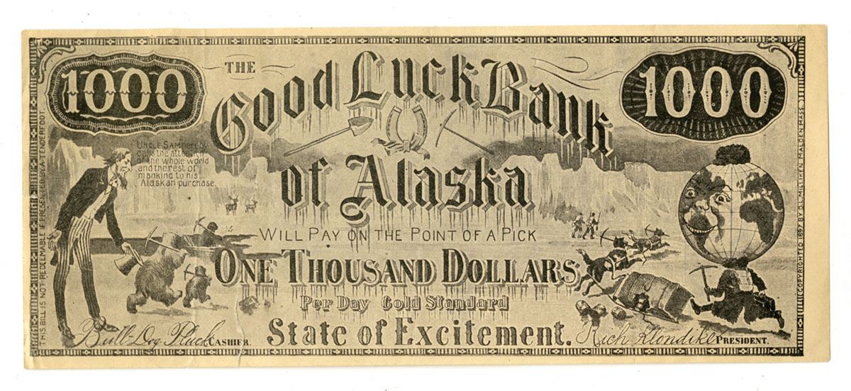 Alaska, and Mystic CT., ND (1890-1900s). Advertising Note printed in the form of a satirical banknote titled “The Gold Luck Bank of Alaska,” promising to pay “One Thousand Dollars per Day Gold Standard” in the “State of Excitement.” Note depicts humorous Klondike Gold Rush scenes with prospectors mining and chasing gold, along with a caricature of Uncle Sam promoting the Alaska rush, Reverse features an advertisement for P. J. Butten, Custom Tailor, Mystic, Connecticut, with a caricature of John D. Long, Secretary of the Navy, promoting suits, pants, and overcoats. Notes is in XF to AU condition with repaired 1/2 inch tear at bottom left that is difficult to see. Scarce Alaska Gold Rush advertising note. .