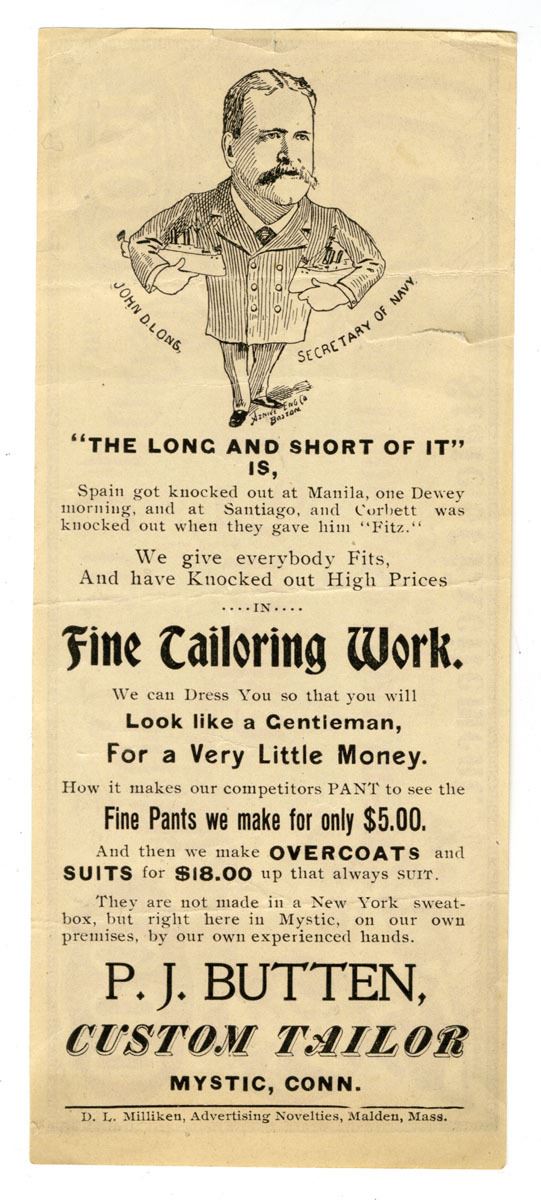 Alaska, and Mystic CT., ND (1890-1900s). Advertising Note printed in the form of a satirical banknote titled “The Gold Luck Bank of Alaska,” promising to pay “One Thousand Dollars per Day Gold Standard” in the “State of Excitement.” Note depicts humorous Klondike Gold Rush scenes with prospectors mining and chasing gold, along with a caricature of Uncle Sam promoting the Alaska rush, Reverse features an advertisement for P. J. Butten, Custom Tailor, Mystic, Connecticut, with a caricature of John D. Long, Secretary of the Navy, promoting suits, pants, and overcoats. Notes is in XF to AU condition with repaired 1/2 inch tear at bottom left that is difficult to see. Scarce Alaska Gold Rush advertising note. .