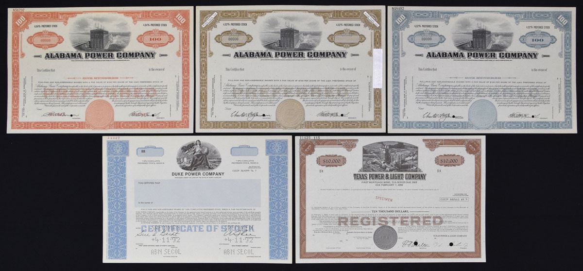 Alabama, North Carolina, Texas, ND (1970s)-1992. Lot of 5 Specimen Stock Certificates, Includes: Alabama Power Co. (3), Duke Power Co., and Texas Power & Light Co. Certificates are all marked Specimen with either overprints or pin punches, Uncirculated condition. (5). Sold "AS IS" no returns accepted.