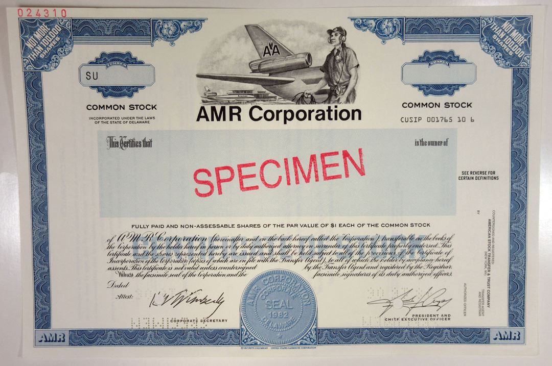 AMR Corp., 2006 <100,000 Shrs Specimen Stock Cert., XF SC-USBN Blue. AMR Corporation was a commercial aviation business and airline holding company based in Fort Worth, Texas, which was the parent company of American Airlines, American Eagle Airlines, American Connection and Executive Airlines. AMR filed for Chapter 11 bankruptcy in November 2011, and merged with US Airways Group on December 9, 2013 to form American Airlines Group, Inc.