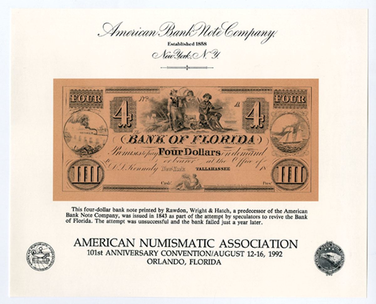 Orlando, Florida, 1992. Lot of 65+ $4 Bank of Florida Souvenir Cards, Original Note was printed by Rawdon, Wright & Hatch in 1843 in an attempt to revive the bank, but it failed one year later, ABN certification on back. Mint condition and in original envelopes, ABNC. (65+). Sold "AS IS" no returns accepted.
