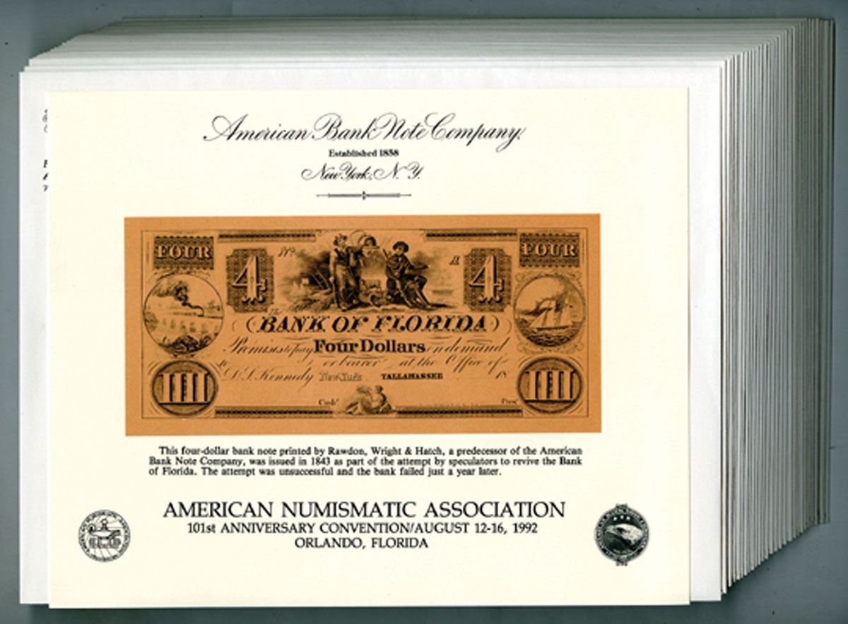 Orland, Florida, 1992. Lot of 32, $4 Bank of Florida Souvenir Cards, Original Note was printed by Rawdon, Wright & Hatch in 1843 in an attempt to revive the bank, but it failed one year later, ABN certification on back. Mint condition and in original envelopes, ABNC. (32). Sold "AS IS" no returns accepted.