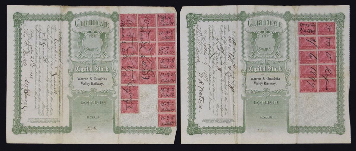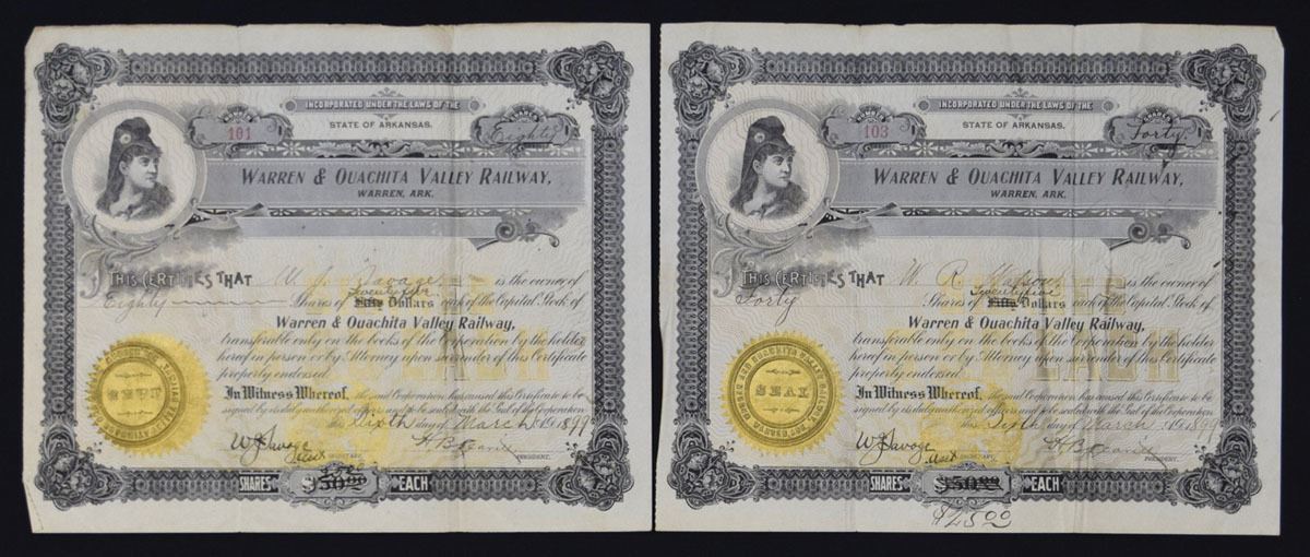 Arkansas.., 1899, Lot of 2, Warren & Ouachita Valley Railway, I/U Stock certificates, 40, and 80 share certificates. VF condition. (2). This railroad only has listed cancelled stock certificates, these are both uncancelled. Rare in this format.