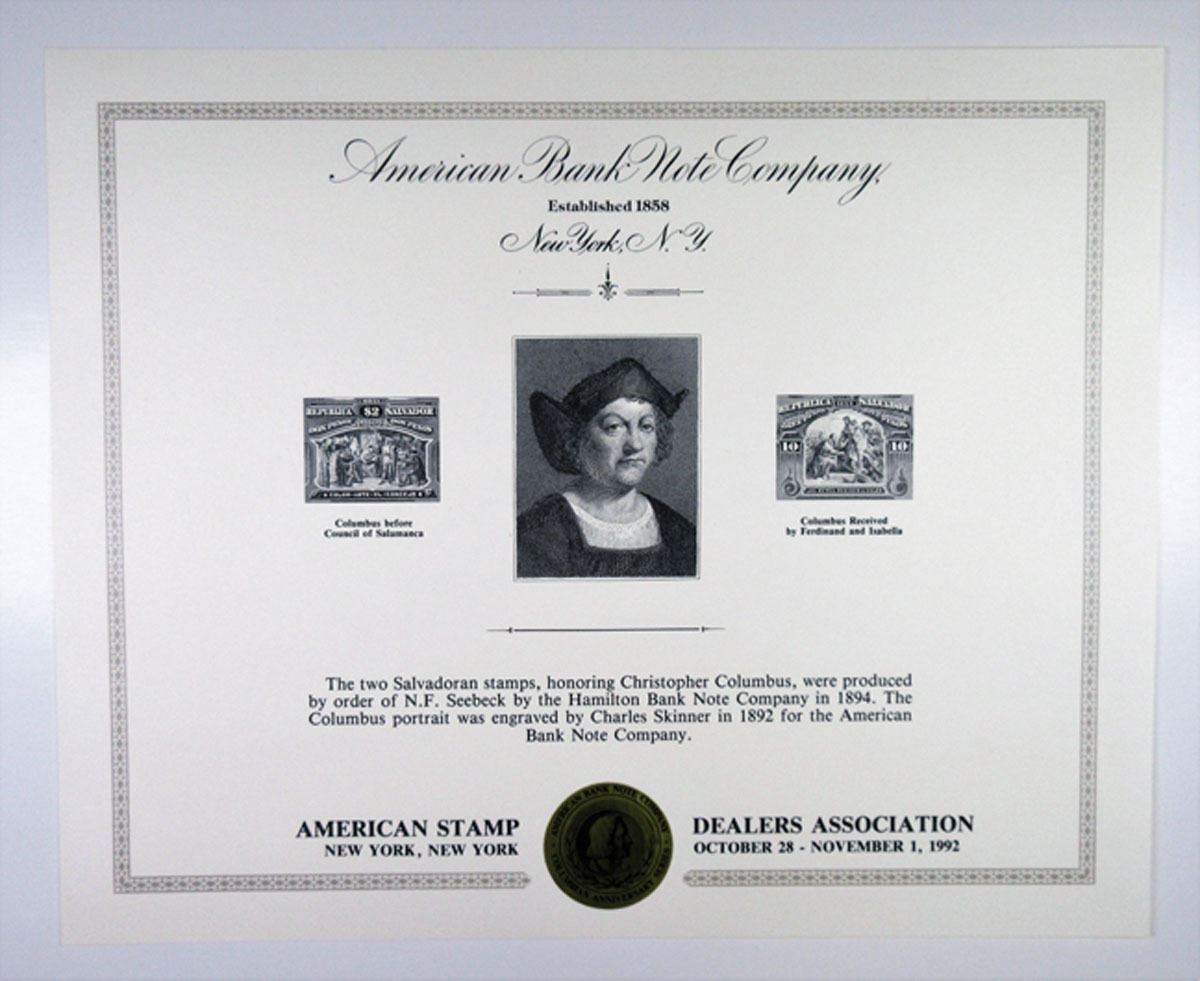 ASDA New York, NY, Lot of 24, October-November 1992. Souvenir cards featuring an intaglio portrait of Christopher Columbus in the middle flanked by 2 different 1894 El Salvador stamps featuring Christopher Columbus, which was produced by Hamilton Banknote Co in 1894, "Columbus before Council of Salamanca" and "Columbus Received by Ferdinand and Isabella." Between the two reproductions is a portrait of Columbus engraved by Charles Kinner in 1892 for the ABNC. Lots are in original ABNC envelopes. (24).