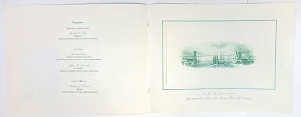 New York, 1993 souvenir folder with tipped in proof vignette of the Brooklyn Bridge as well as 3 sets of U.N. stamps ties on the back inner cover. The banquet was honoring Anthony J. Fouracre, Chief of the U.N. Postal administration. Mint condition. Rare souvenir poster.