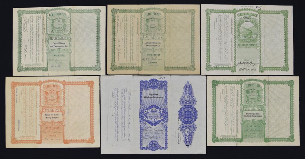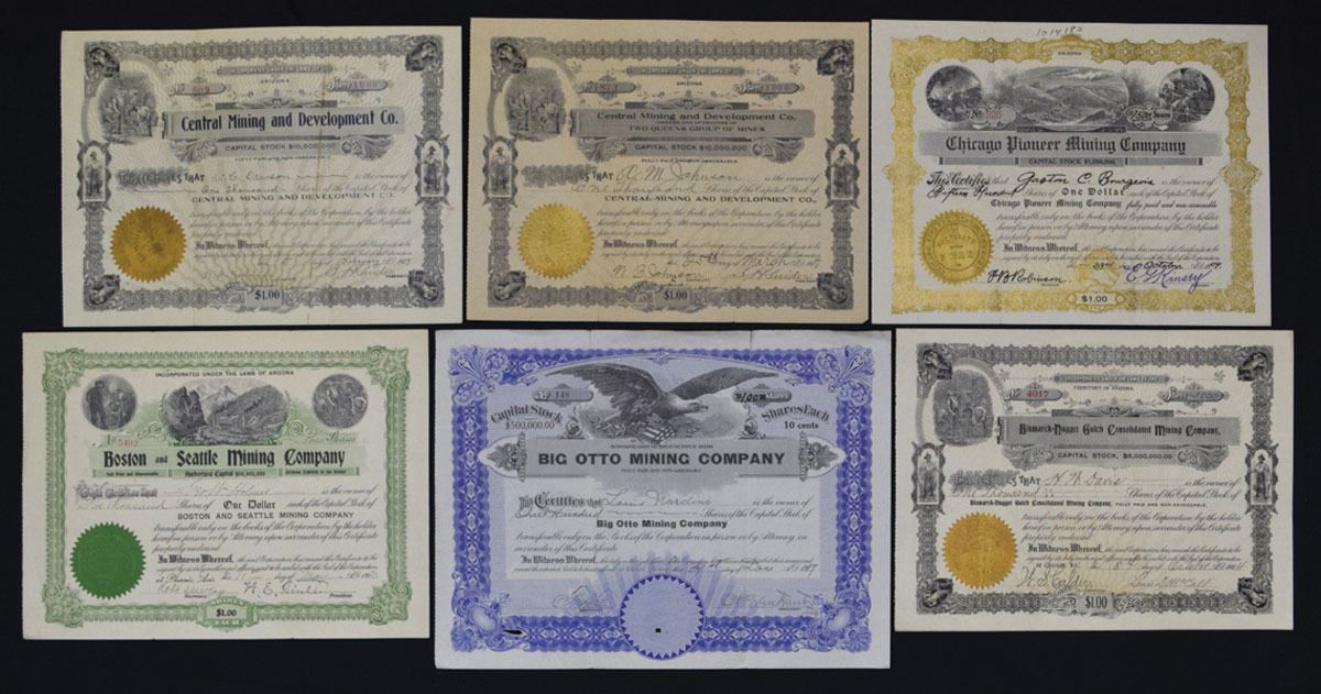 Arizona.., 1903-17. Lot of 6 I/U Mining Stock Certificates representing early statehood-era Arizona mining operations, each with ornate engraved borders, mining vignettes, and embossed corporate seals. Includes examples from Central Mining and Development Co. (2); Chicago Pioneer Mining Co.; Boston and Seattle Mining Co.; Big Otto Mining Co.; and Bismarck-Nugget Gulch Consolidated Mining Co. Conditions range from VF to VF+ overall, with minor handling and light archival notations on select examples. (6). Sold “AS IS” no returns accepted.