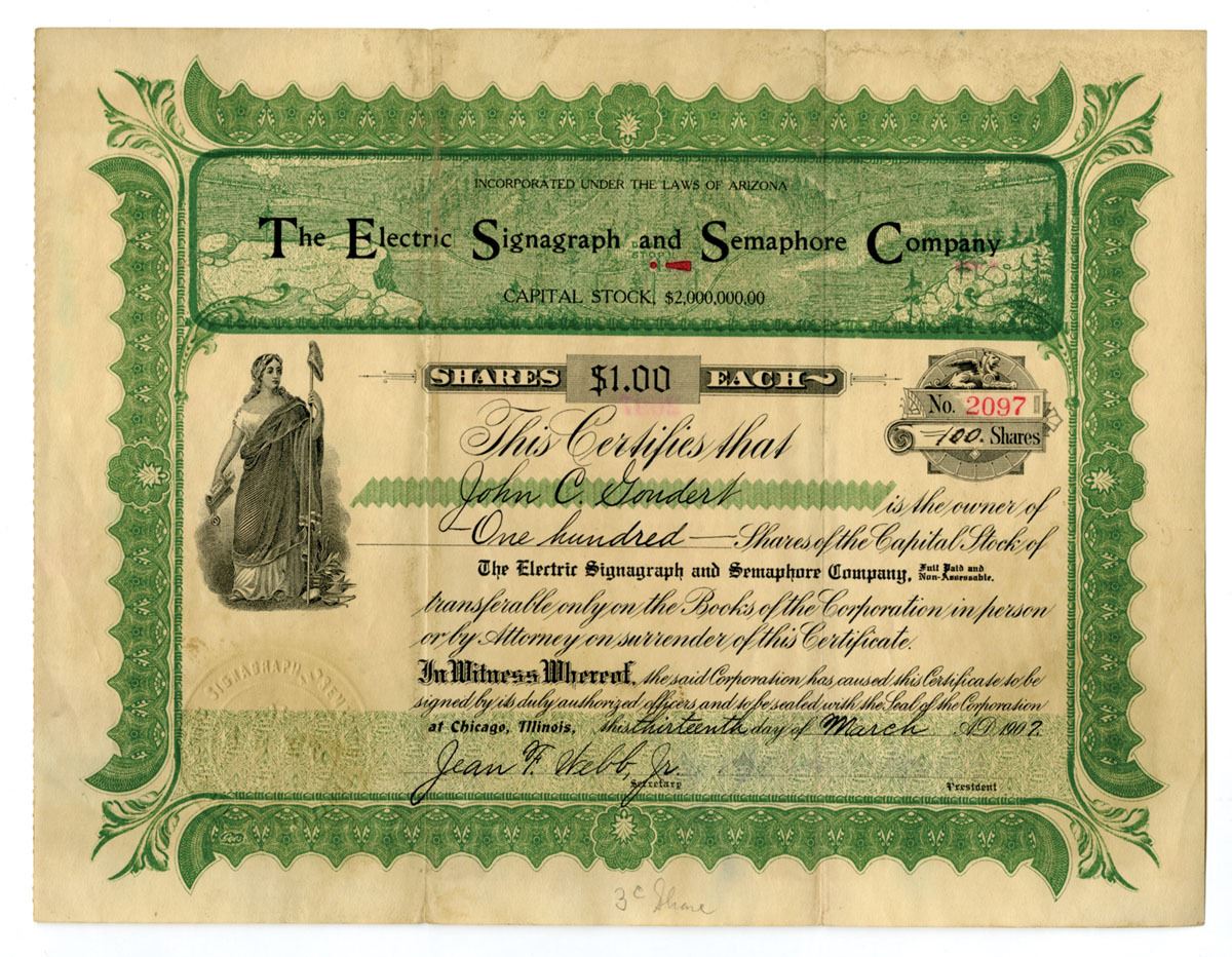 Arizona..., 1907. 100 Shares Capital Stock I/U Certificate, Black print with green border and underprint, Company title at top center over vignette of mountain side and allegorical woman at left, S/N 2097, Fine to VF condition with staining. The Electric Signagraph and Semaphore Company was an early electrical signaling enterprise associated with the development of visual and electrically controlled signal systems used in transportation and industrial settings.