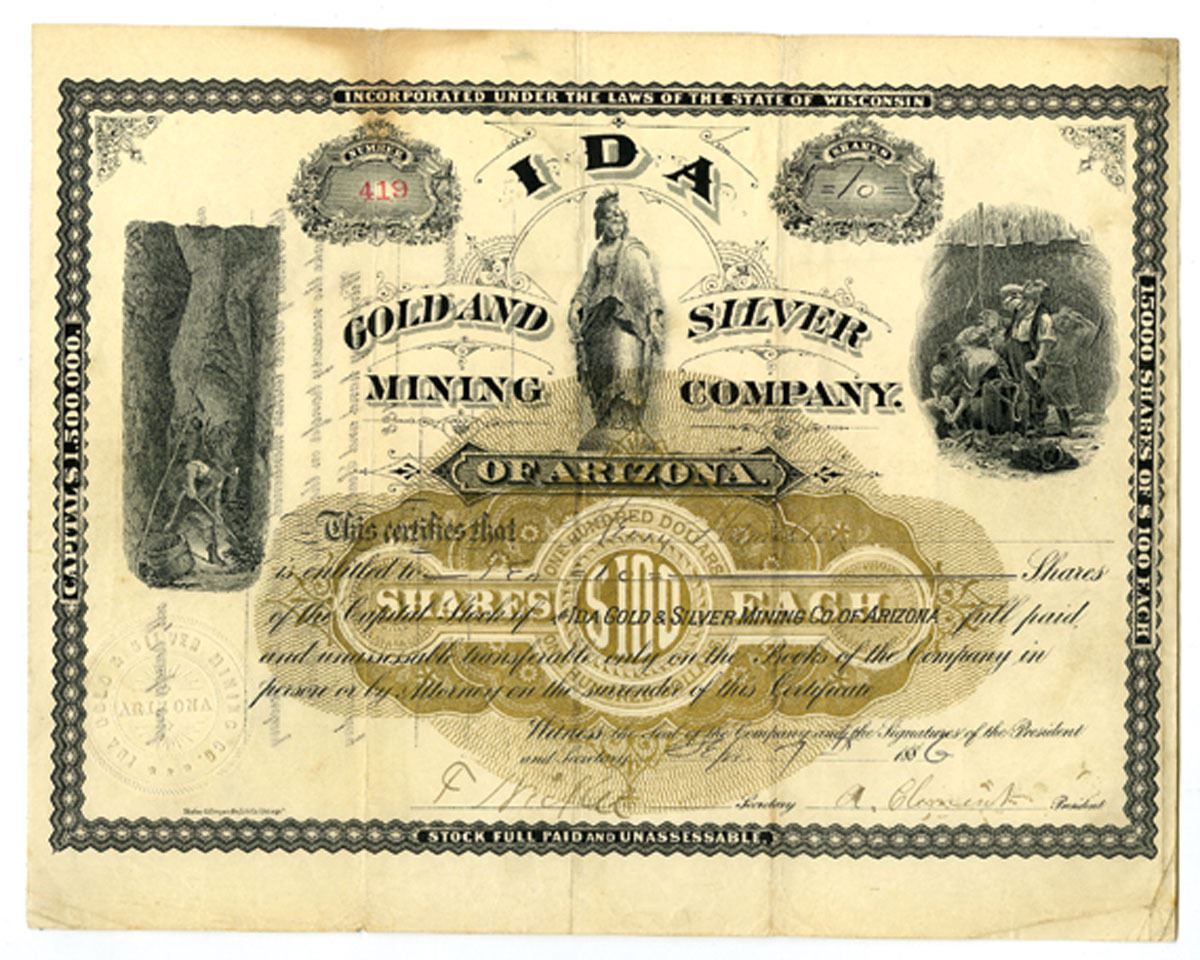 Prescott, Arizona Territory, 1881, Ida Gold and Silver Mining Company, 100 Shares I/U stock certificate, S/N 419, black print with brown underprint and ornate border, central vignette of a standing allegorical female figure flanked by miners at left and right at work, embossed company seal at lower left, issued under the laws of Wisconsin, signed by the company president and secretary; VF to Choice VF condition or better.