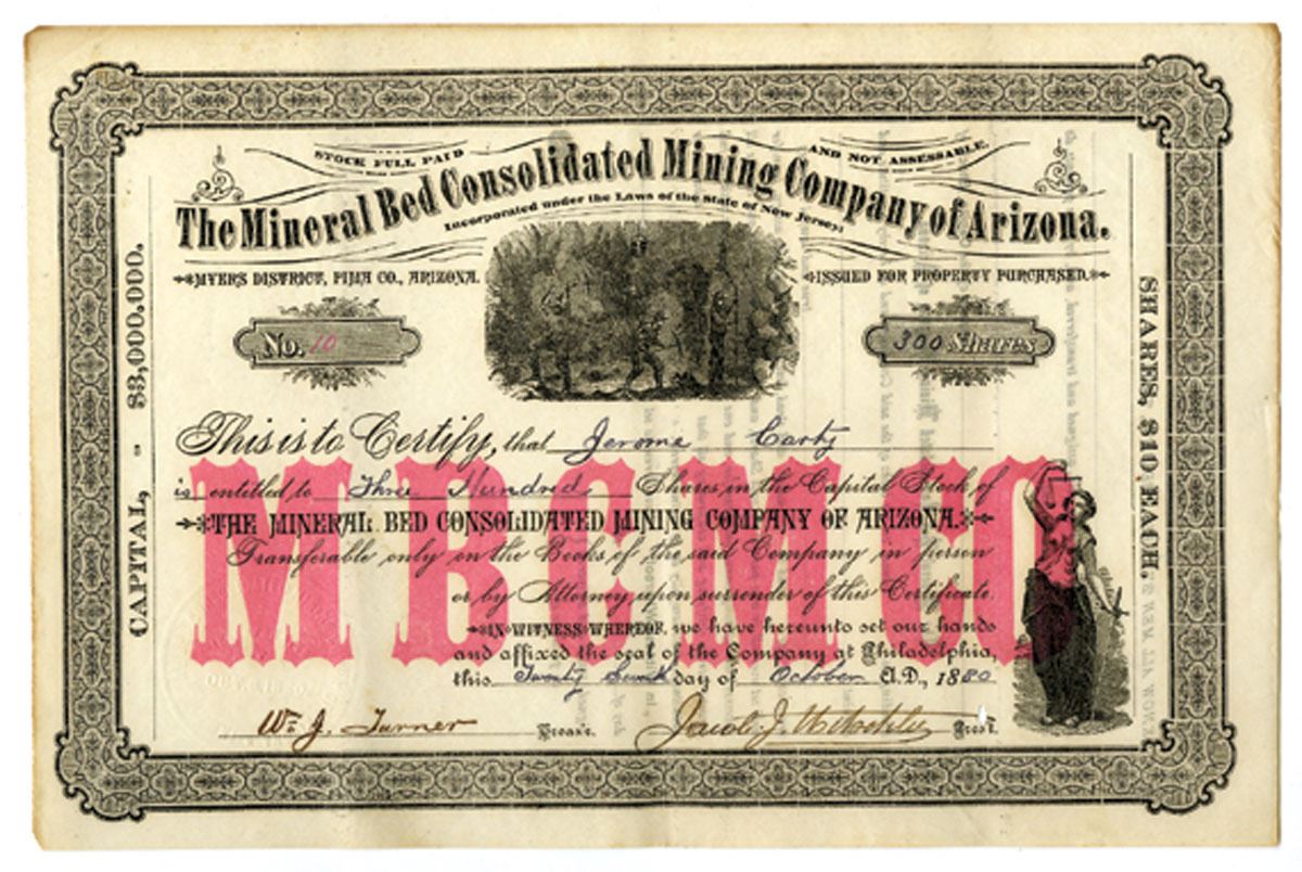 Myers District, Pima County, Arizona Territory, (Inc. in New Jersey), 1880. 300 Shares I/U Stock Certificate, Black print with black border and red underprint, Mining vignette under title at top and Lady Justice at right side, S/N 10, Issued to Jerome Carty, and signed by Jacob H. Hitschler as president and William J. Turner as treasurer, VF to XF condition with pinholes.