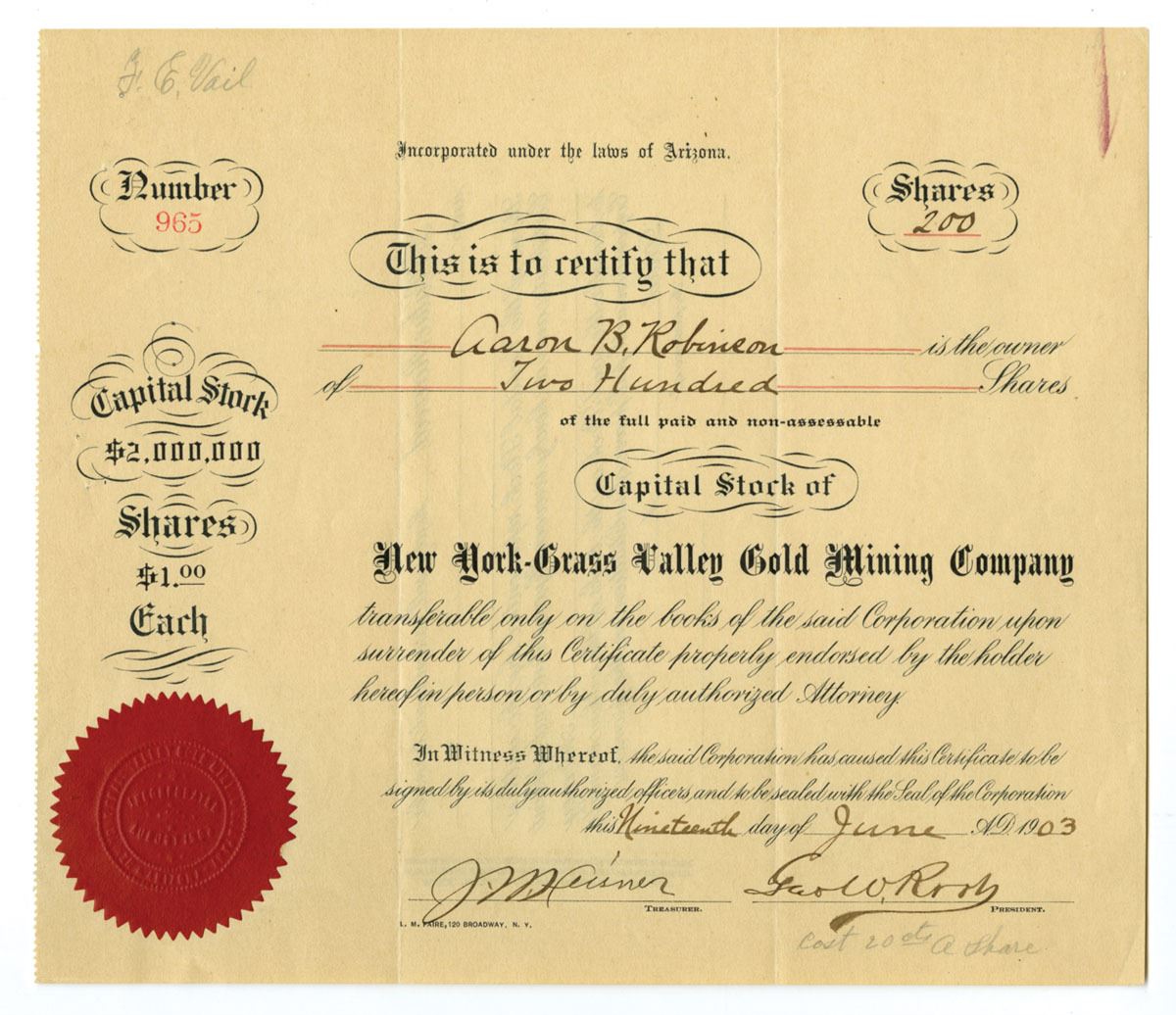 Arizona Territory, 1903. 200 Shares Capital Stock I/U Certificate, Black print with no border with title, S/N 965, VF to XF condition.