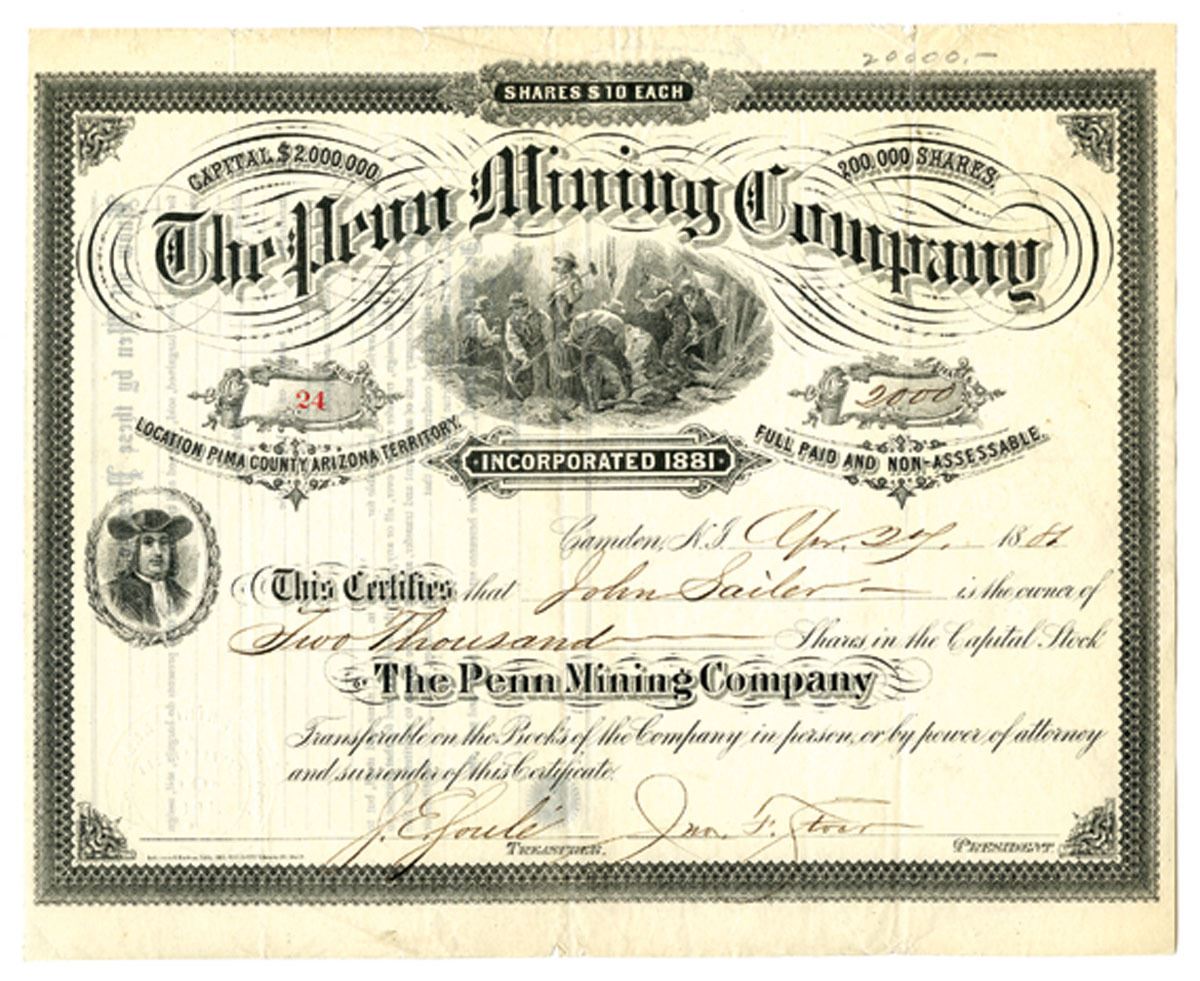 Pima County, Arizona Territory (Incorporated in New Jersey), 1881. 2000 Shares, I/U Capital Stock Certificate, Black print with black border, Men working in mine at center under company title with portrait of Quaker Man at left, S/N 24, Mine was located in Pima County Arizona Territory, VF to XF condition.