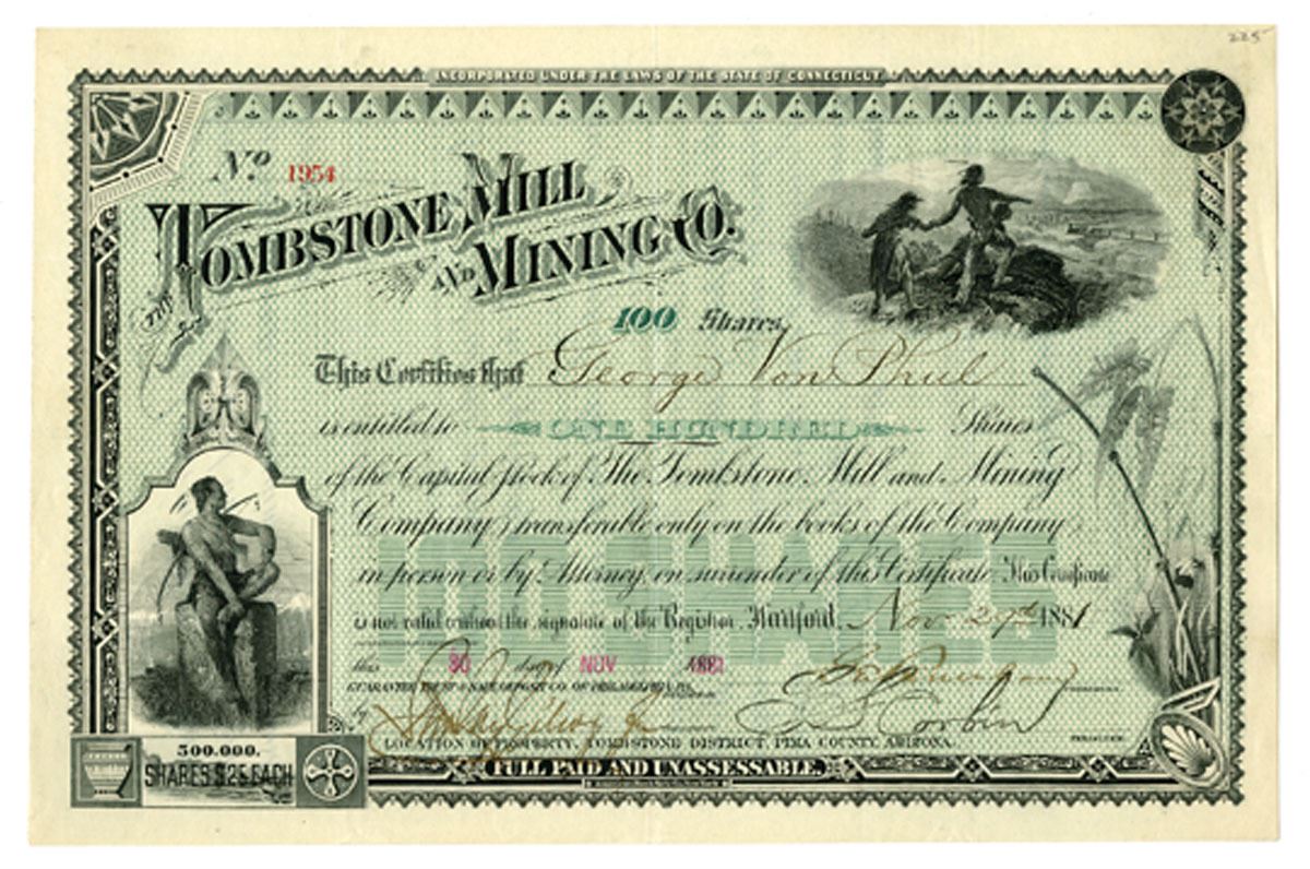 Tombstone, Arizona Territory (Incorporated in Connecticut), 1881. 100 Shares Capital Stock I/U Certificate, Black print with black border and green underprint, Native men at top right corner and Native hunter at bottom left corner, S/N 1954, Mine was located in Tombstone District Pima County Arizona Territory, Certificate is signed by Geo. R. Burnham as president, John B. Gilbert Jr. as President, and S. Corbin as secretary, XF to AU condition, ABNC. The Tombstone Mill and Mining Company was central to the silver boom that transformed Tombstone, Arizona Territory, from a frontier camp into one of the West’s most storied mining towns. Formed after Ed Schieffelin’s legendary silver discovery, the company built the stamp mills that processed ore from rich claims like the Tough Nut, fueling a rush of investment and the rapid growth of Tombstone and nearby mill towns such as Charleston and Contention. Its success attracted powerful Eastern financiers, whose capital brought both prosperity and speculation. Though water problems and falling silver prices eventually doomed large-scale operations, the company’s role in Tombstone’s meteoric rise left an enduring mark on the history of Western mining and the lore of the American frontier.