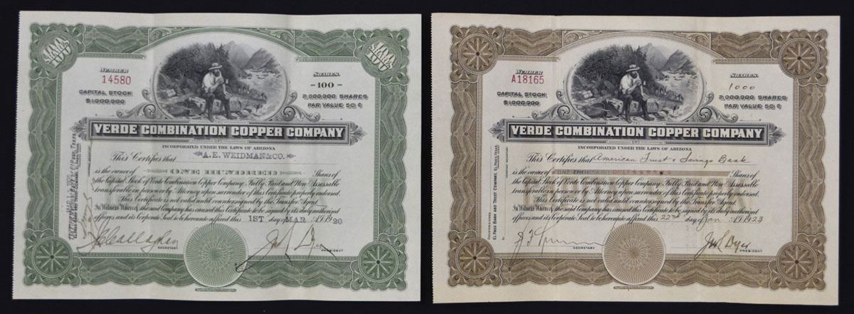 Arizona, 1920 and 1923. Lot of 2, I/U Stock Certificates: 1920, 100 Shares Capital Stock with green border and underprint; 1923, 1000 Shares Capital Stock with brown border and underprint. Both have same vignette of miner sitting by river bank at top center, Certificates are in VF+ condition. RBNC. (2).