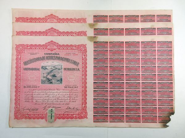 Mexico. Lot of 3 Bonds, All are 100 Pesos = 1 Share, Black on red, Locomotive passing oil tanks pulling train of oil cars, harbor in background, coupons on back, Adhesive revenue stamp on bottom, Fine to VF with some water staining and bond coupon page with evidence of possible burned areas, Coupons attached. AB&PC, Mexico.