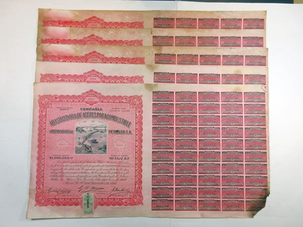 Mexico. Lot of 5 Bonds, All are 100 Pesos = 1 Share, Black on red, Locomotive passing oil tanks pulling train of oil cars, harbor in background, coupons on back, Adhesive revenue stamp on bottom, 2 are in Fine to VF condition with some water staining and bond coupon page with evidence of possible burned areas while 3 additional bonds with considerable water staining and soiling, Coupons attached. AB&PC, Mexico.