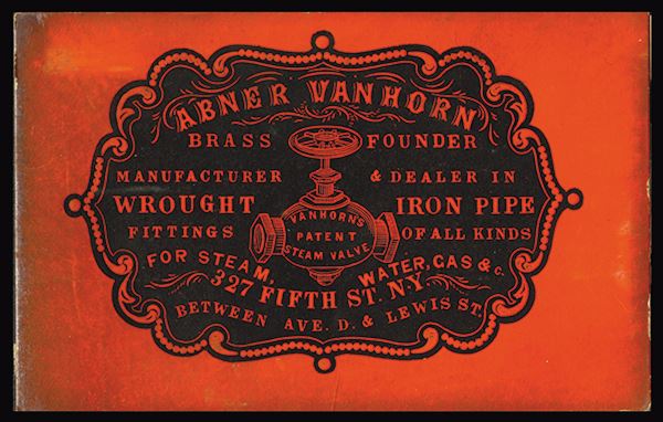 NY. Pipe valve. Black on orange-red thin card, Formerly mounted. (From the Laubenheimer Family Archives, June 2015, Lot #2)