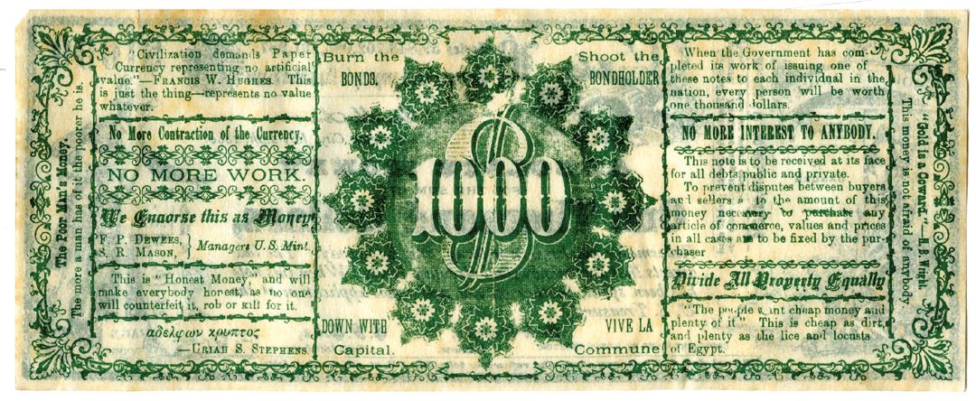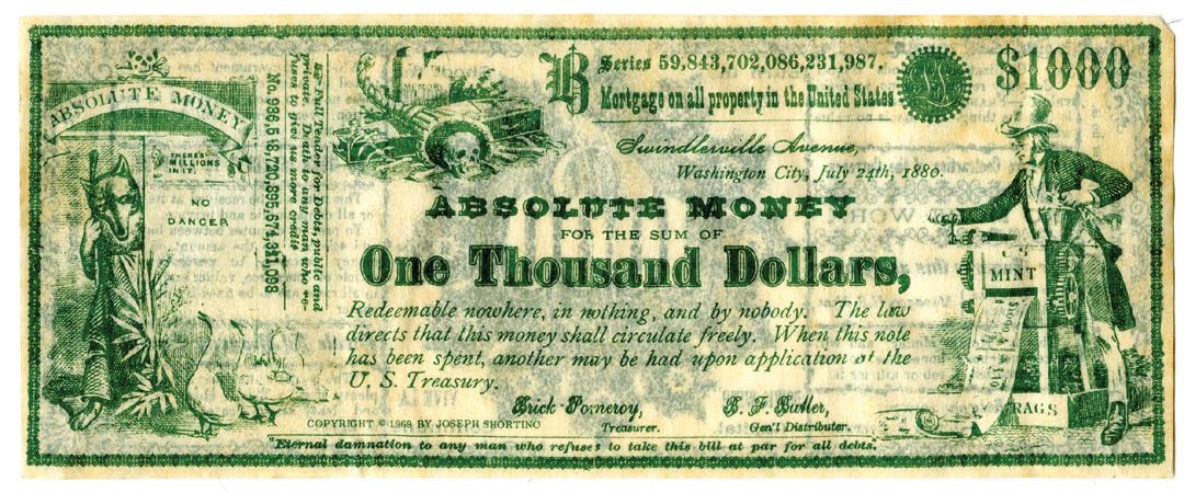 Washington, D.C., 1969. $1000 Absolute Money Satirical Banknote, Green. A very interesting note that decries the issuance of paper money by the United States. At the right is Uncle Sam feeding rags into a machine named the U.S. Mint, with currency being churned out. An interesting commentary on the state of paper money in the United States. There are many other interesting comments and satirical essays on reverse, such as "Burn the Bonds, Shoot the Bondholder" and "Down with Capital, Vive la Commune." XF condition.