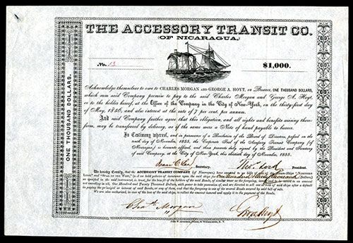 Nicaragua (Incorporated and offices in NY), 1855, $1000, I/U bond, #13, black on thin off white paper, steamship in middle, VF condition. Historic company that was set up by Cornelius Vanderbilt and others during the California Gold Rush in the early 1850's to transport prospects from the East Coast of the U.S. to the West Coast. Travelers would take a steamer from NY to the Mosquito Coast of Nicaragua where they would travel by stagecoach and steamboat to the pacific coast and then onto San Francisco. Accessory Transit offered the cheapest method of traveling to California, $300 initially and then later reduced to $150 and at its peak was carrying over 2000 passengers per month. After 1857, Vanderbilt approached Pacific and U.S. Mail Steamship Companies that ran a route across Panama and agreed to basically Green mail by stopping his business for a monthly stipend of $56,000. Rare and historic certificate that is missing from most collections.