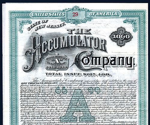 New Jersey, 1890, $1000, 6% 2nd Mortgage “A “ Income Gold Bond, #29, Black on green border and underprint, No vignette, VF condition.