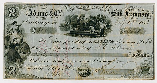 Sonora (Over crossed out San Francisco) 1853, 2nd of Exchange, On blue paper. Miners, center, women, left. VF details, repaired fold split, TCC&C.