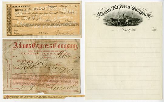 New York & Connecticut, 1863-65. Includes Adams Express Letterhead, unused, with Intaglio printed harbor scene with steamboat in background and workers with bales, boxes and barrels in foreground, under title. Printed by National BNC, Unc.; Bridgeport, CT., 1863, Receipt for 1 bond, value $500, on ornate apricot colored safety paper; and, 1865, Serial #1, Boston receipt, a bit dirty, 1865. 3 pieces. Sold "AS IS" no returns accepted.