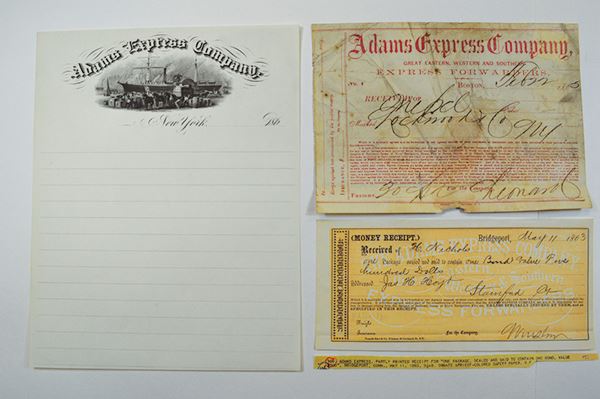 NY. CT. Letterhead, unused; Receipt for bond, Bridgeport, CT, 1863; Boston receipt, a bit dirty, 1865. 3 pieces.
