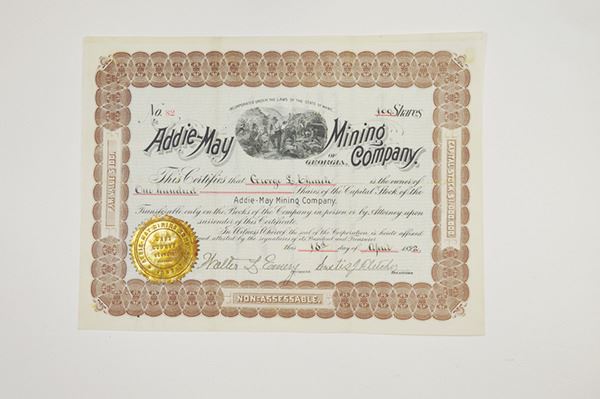 Maine. 100 Shares Capital Stock Issued Certificate, Black print on brown border and blue under tint, Company title at top with men mining between words of title, Mine was located in Georgia while being incorporated in Maine, VF-XF condition.