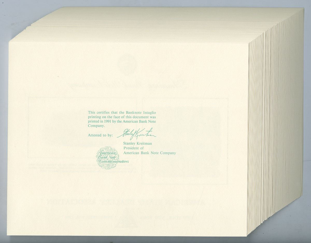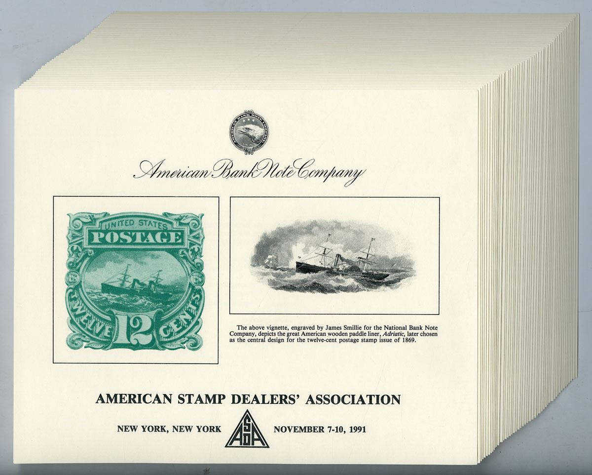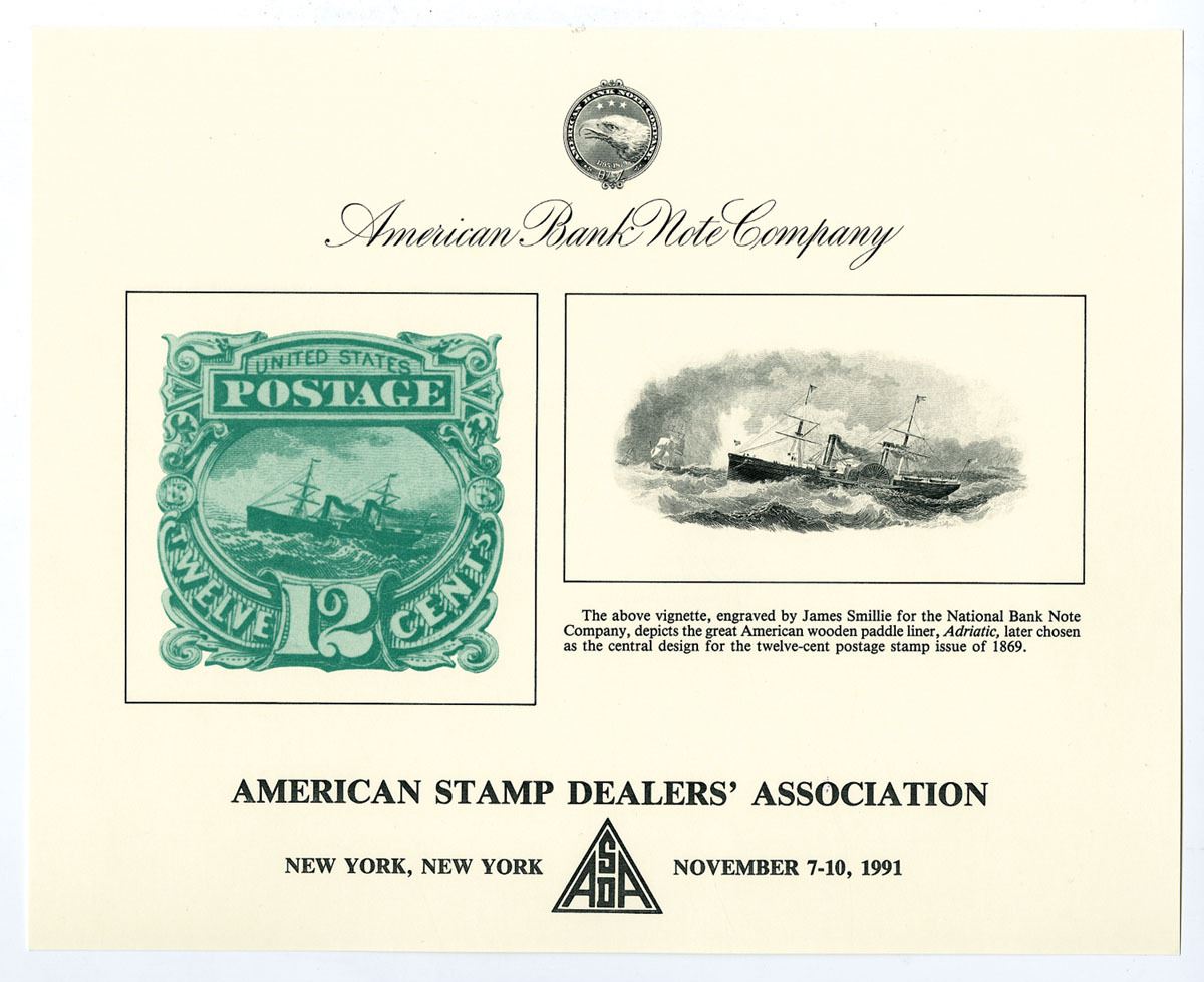 American Stamp Dealers' Association New York, NY November 7-10 1991. Vignette engraved by James Smillie for the National Bank Note Co. depicts great American wooden paddle liner 'Adriatic' later chosen as the central design for the twelve cent postage stamp issue of 1869. Uncirculated as made, ABNC. (50)