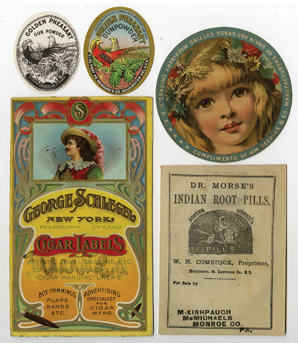 Lot of 5 Items, Includes: Dr. Morse's Indian Root Pills Pamphlet, describing the history and benefits of the product and has customer testimonials about the success of the medicine; Deering Grain and Grass-Cutting Machines Advertisement from Wm. Deering & Co. with a colorful face of a young girl at center; George Schlegel New York Cigar Label Advertisement, Very colorful with a man at top; E.I. Du Pont de Nemours- Golden Pheasant Gunpowder Label (2). Items range from VF to XF condition. (5). Sold "AS IS" no returns accepted.