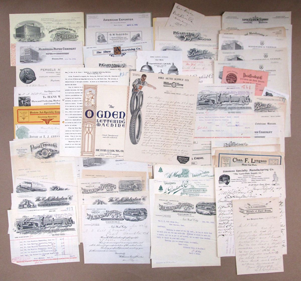Various States, ca.1870-1930s. Lot of 65+ Letters and Documents, Included: Ogden Lettering Machine manual and letter, Hill Auto Supply Co. correspondence, John L. Whiting & Son Co., Wilkinson Brothers & Co. Inc.., Marshall Paper Co. and more. Letters range from Fine to XF condition. (65+). Sold "AS IS" no returns accepted.
