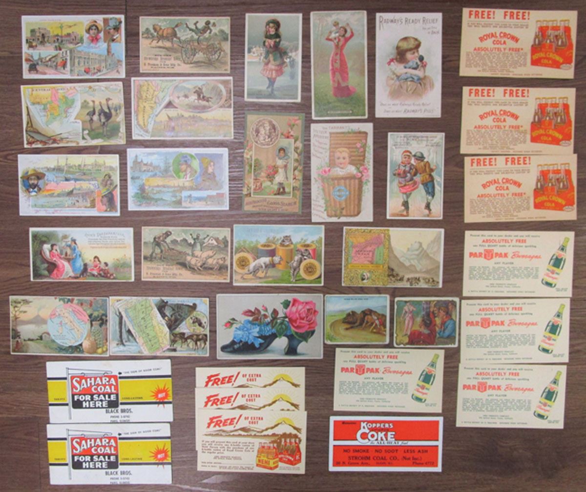 California....., Illinois, Wisconsin and Other Locations, Lot of 34 Advertising Post Cards, Trade Cards, and blotters, includes: Advertising Post Cards with Royal Crown Soda ads, Cork Tip Cigarettes, J & P Coats, and more. Cards range from Fine to XF condition. (34). Sold "AS IS" no returns accepted.