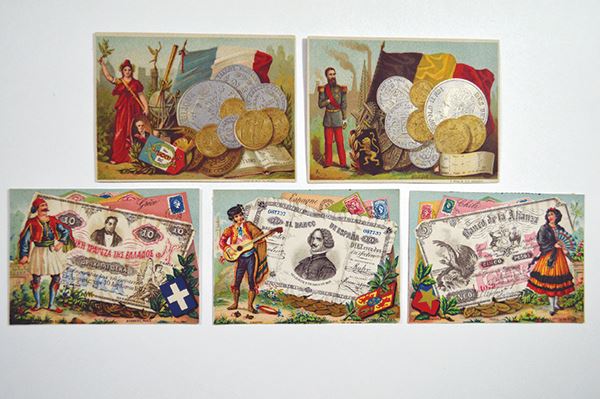 Three cards fracture Bank Notes from Chile, Greece and Spain. The fourth has coins from Belgium. 4 pieces. Some formerly mounted.